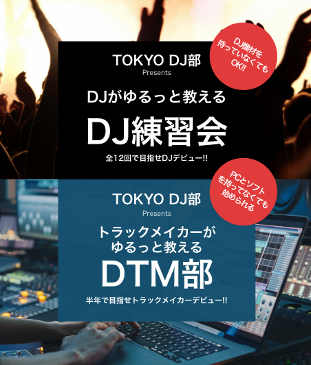 DJコースでは全12回の練習と勉強を経てDJデビューを目指します。DTMコースでは全7つのカリキュラムを通して曲を作成。クラブミュージック制作と電子音楽制作から選べます。